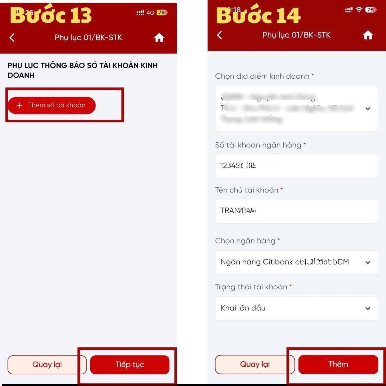 Bước 13–14: Khai tài khoản ngân hàng (bắt buộc)