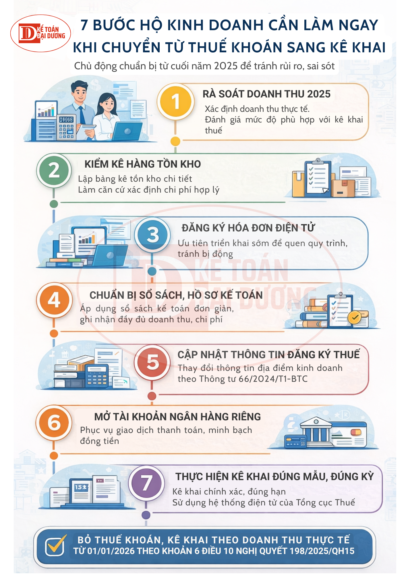 Từ ngày 01/01/2026, hộ kinh doanh và cá nhân kinh doanh chính thức không còn áp dụng thuế khoán theo quy định tại Khoản 6 Điều 10 Nghị quyết 198/2025/QH15. Việc chuyển sang kê khai thuế theo doanh thu thực tế là bắt buộc. Bài viết dưới đây tổng hợp những việc hộ kinh doanh cần làm ngay để chủ động chuyển đổi, hạn chế rủi ro và sai sót pháp lý.