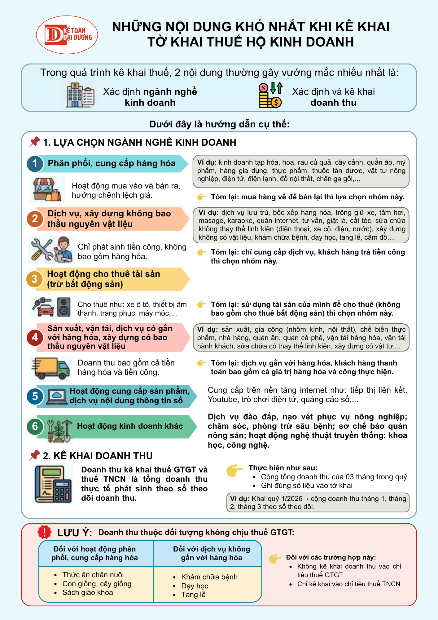 Việc kê khai thuế hộ kinh doanh sẽ dễ dàng hơn khi xác định đúng ngành nghề kinh doanh và doanh thu thực tế phát sinh. Đây là hai yếu tố quan trọng giúp đảm bảo kê khai chính xác, tuân thủ quy định và hạn chế rủi ro về thuế.