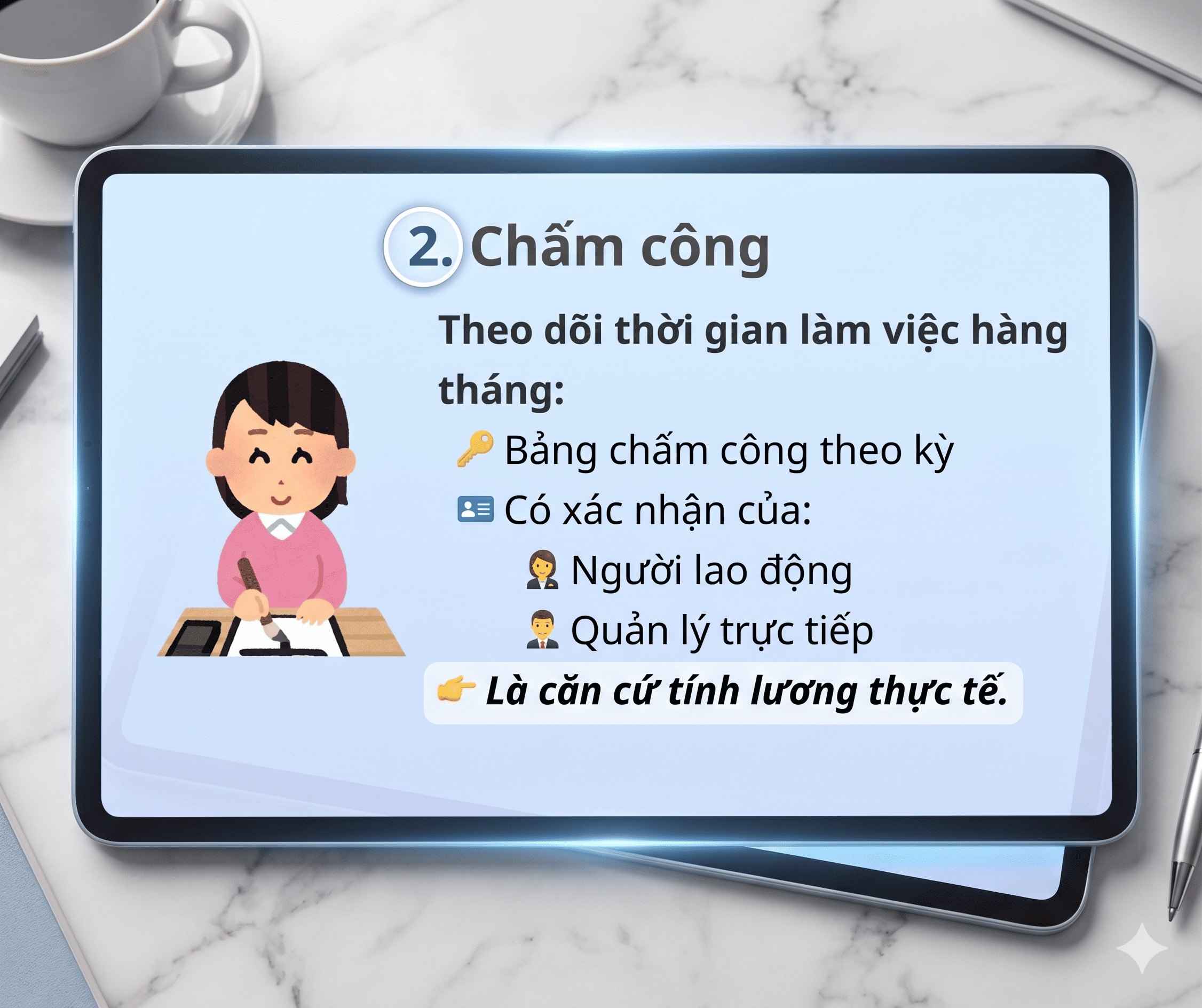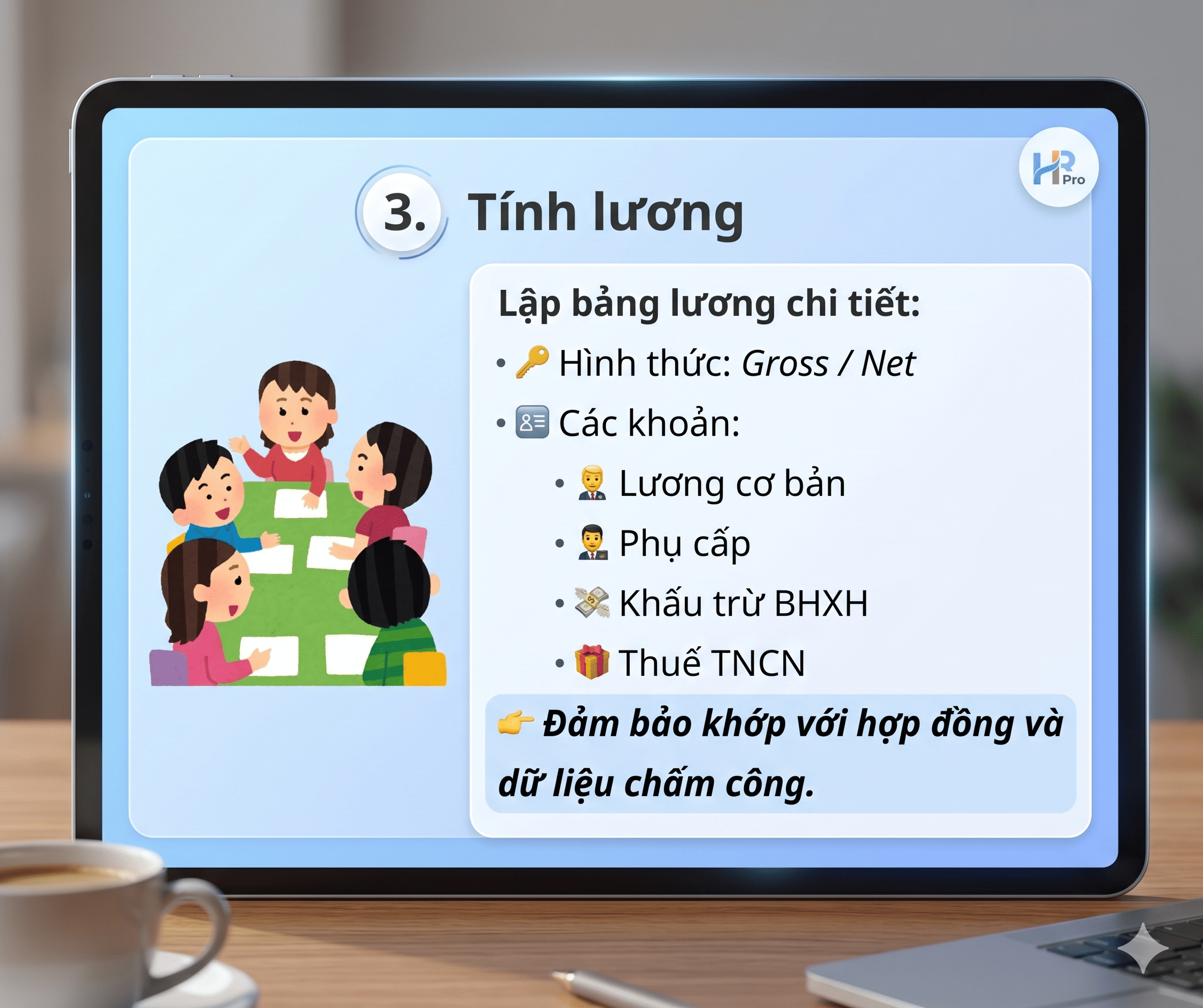 Bảng lương cần được xây dựng rõ ràng theo hình thức Gross hoặc Net và phải khớp hoàn toàn với hợp đồng lao động cùng dữ liệu chấm công. Các khoản mục bắt buộc gồm: