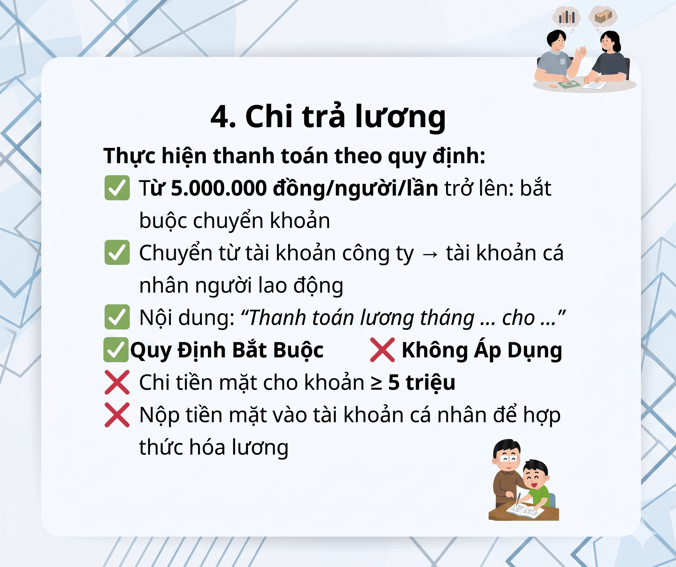 - Dòng tiền: Phải chuyển trực tiếp từ tài khoản công ty sang tài khoản cá nhân người lao động.