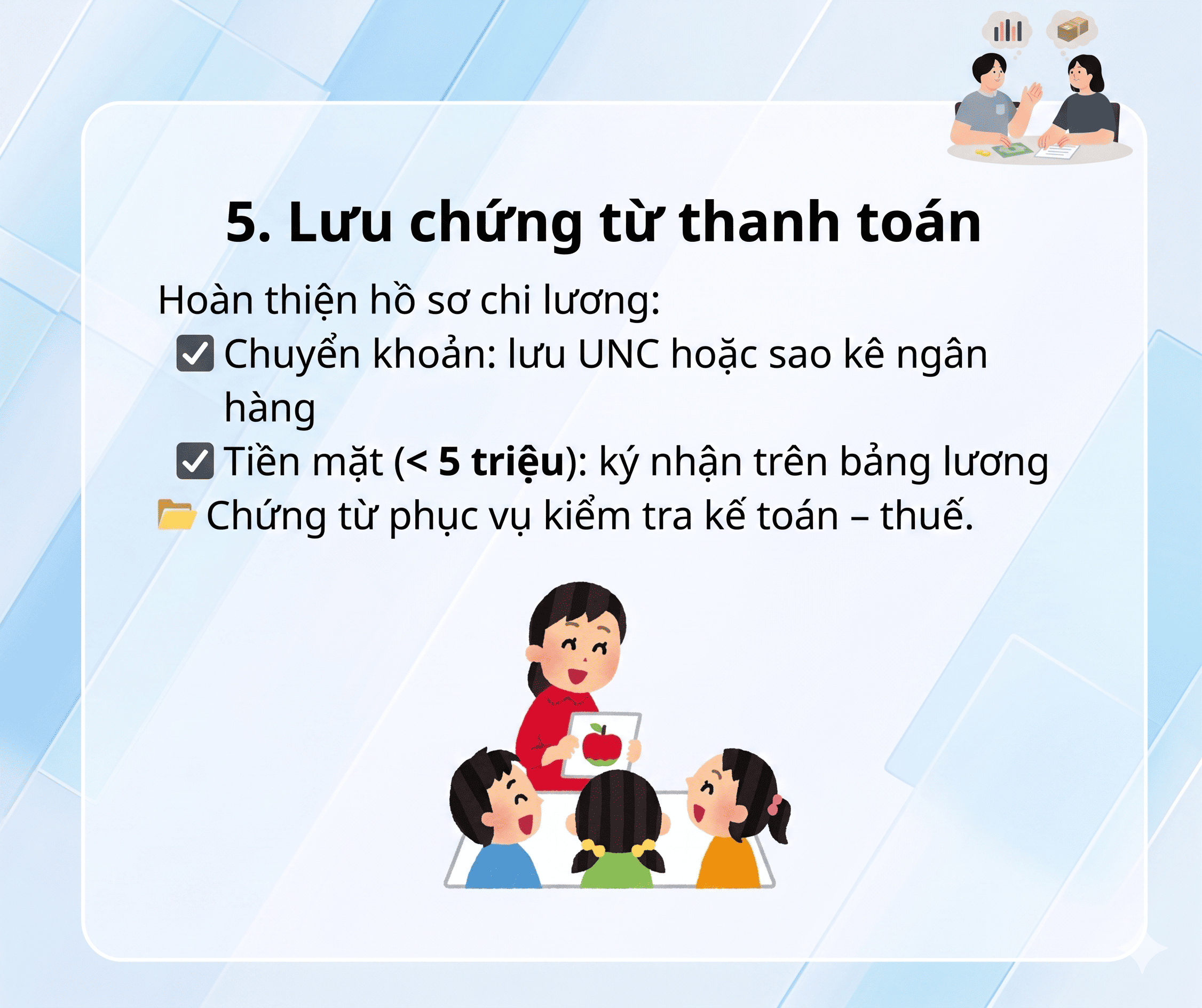 - Nội dung chuyển khoản: Ghi rõ "Thanh toán lương tháng... cho...".