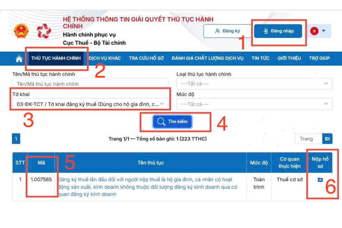 Bước 3: Nhấn “Tìm kiếm”, lựa chọn thủ tục có mã “1.007565” – Đăng ký thuế lần đầu cho hộ gia đình, cá nhân.