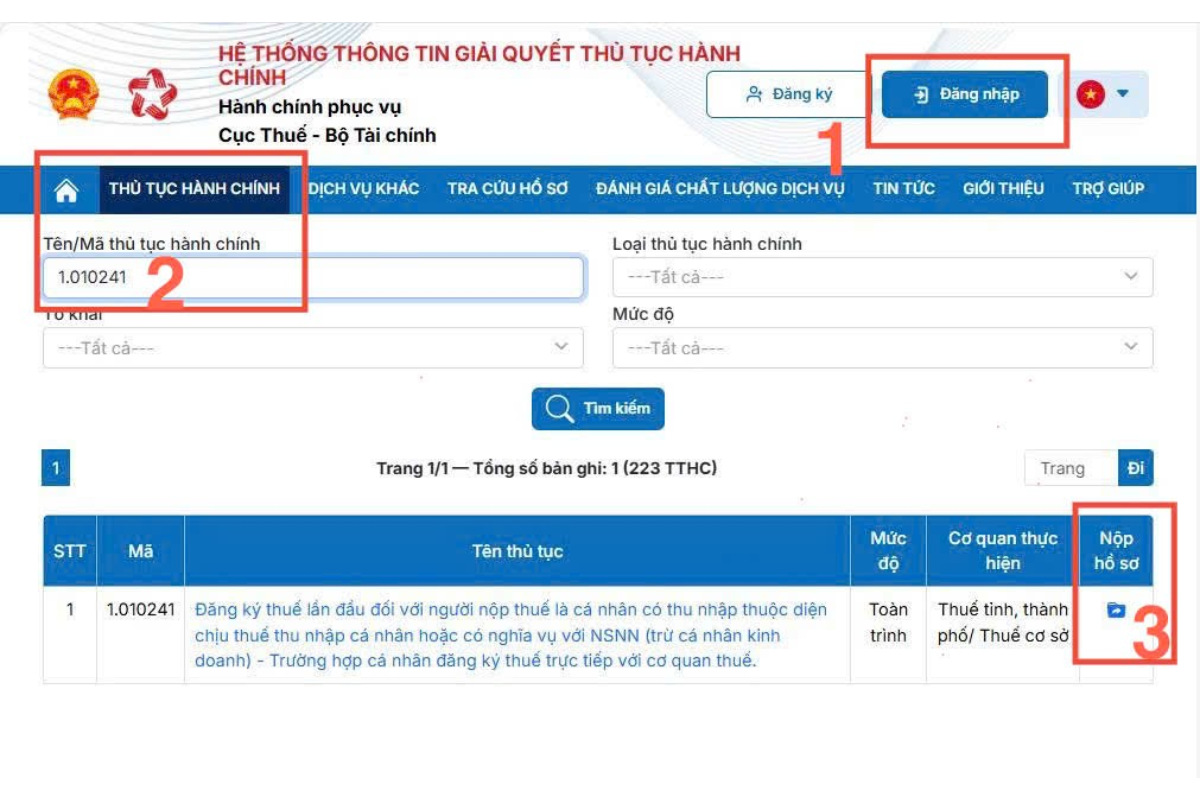 Bước 2: Tại mục “Thủ tục hành chính”, nhập mã thủ tục “1.010241”