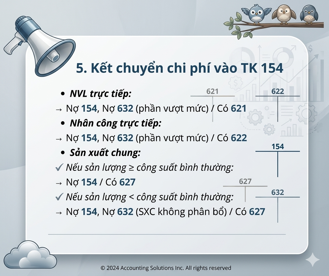 Cuối kỳ, toàn bộ chi phí tập hợp ở TK 621, 622, 627 được kết chuyển vào TK 154: