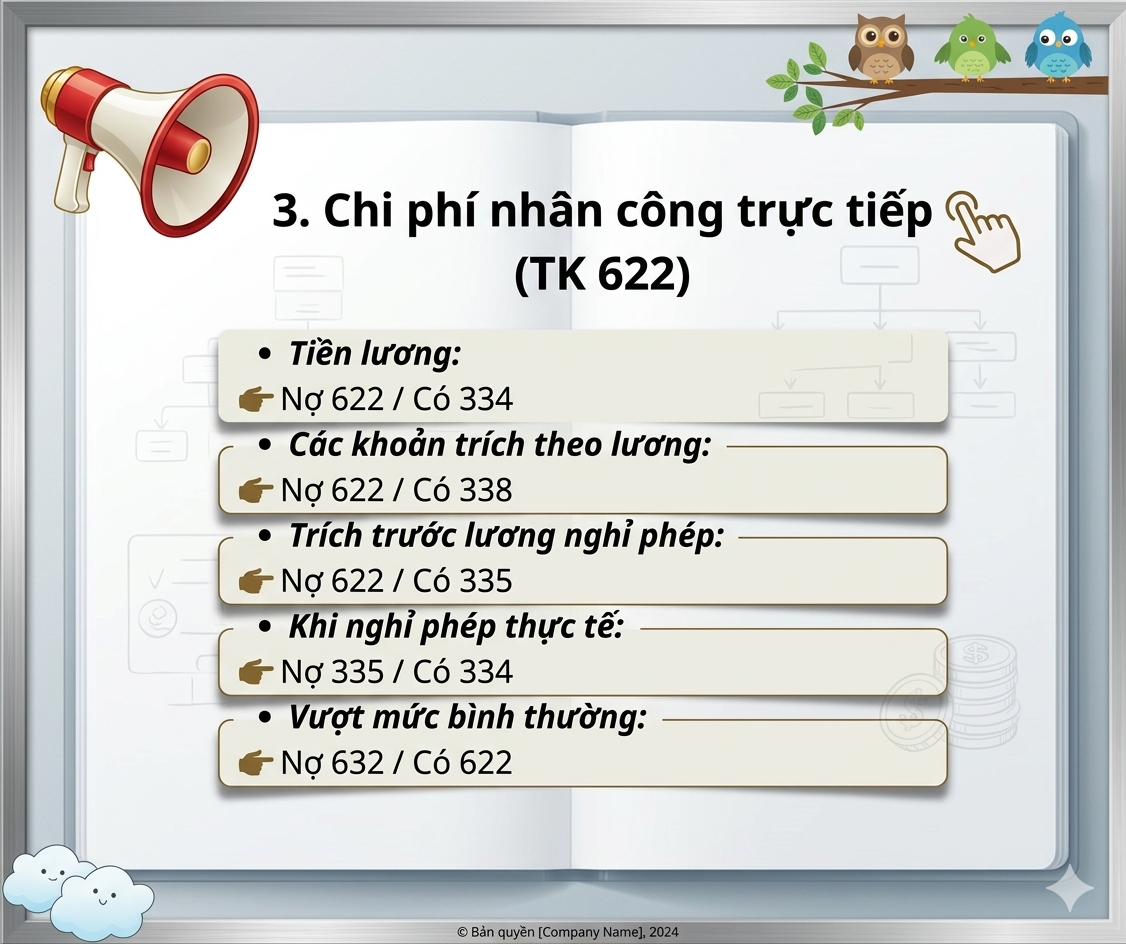 Nợ TK 154 (phần trong định mức)Nợ TK 632 (phần vượt mức) Có TK 621Nhân công trực tiếp: