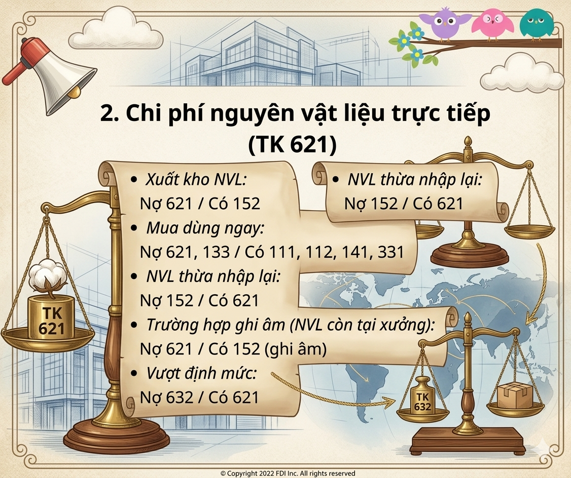 Chi phí NVL trực tiếp được tập hợp vào TK 621, tùy từng tình huống: