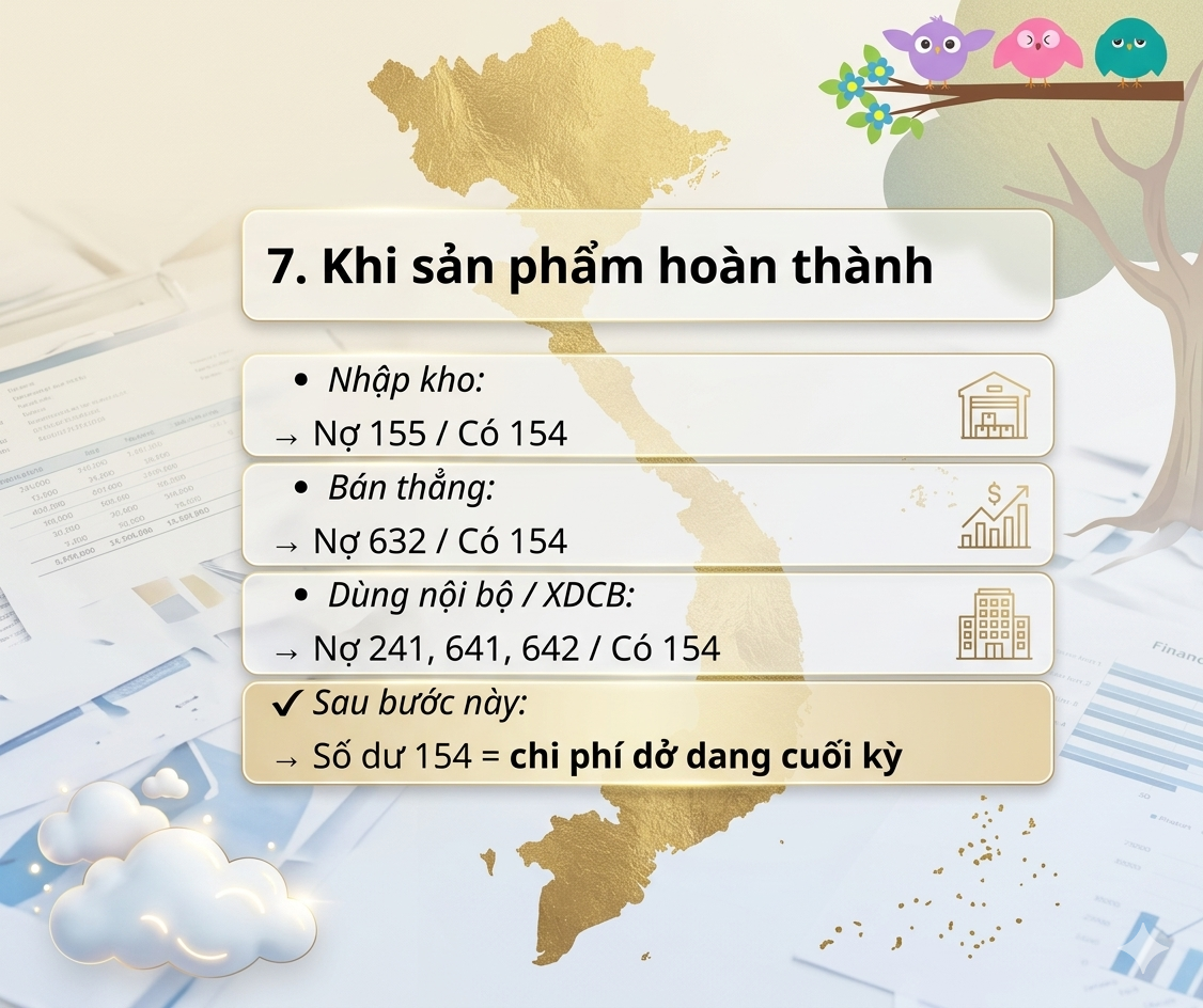 | Nhập kho thành phẩm | Nợ TK 155 / Có TK 154 |