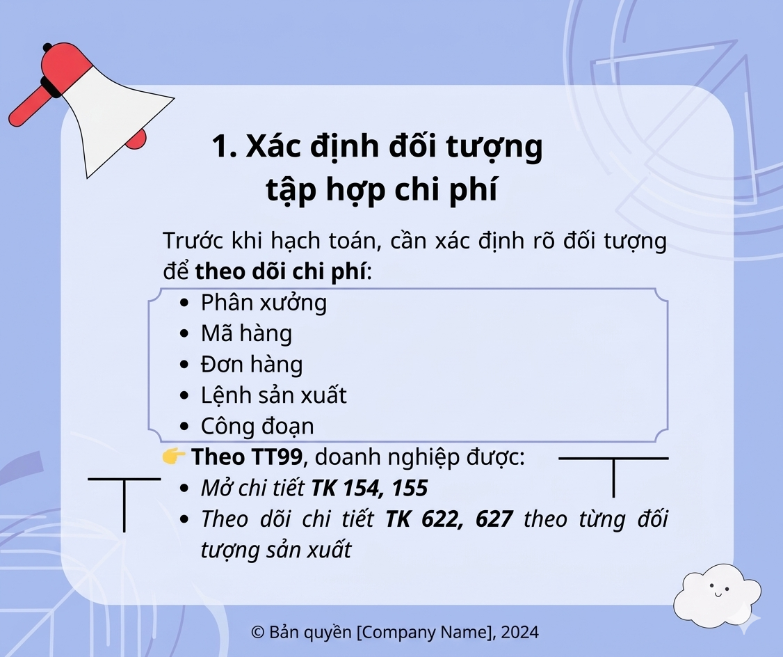 Theo Thông tư 99, doanh nghiệp được phép mở chi tiết TK 154, 155 và theo dõi chi tiết TK 622, 627 theo từng đối tượng sản xuất tương ứng. Đây là bước nền tảng — xác định sai đối tượng sẽ dẫn đến phân bổ chi phí sai toàn bộ.