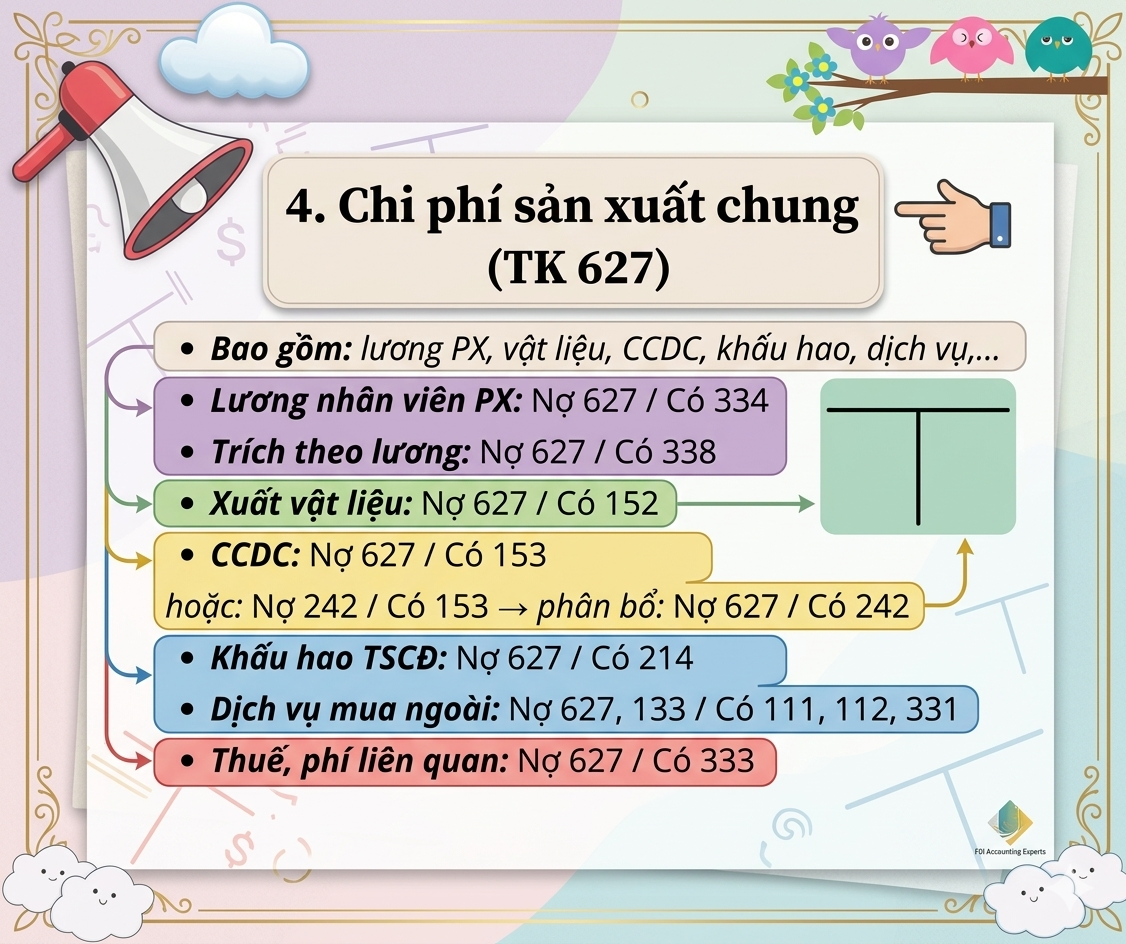 Công cụ dụng cụ (CCDC): Nợ TK 627 / Có TK 153 (hoặc phân bổ dần: Nợ TK 242 / Có TK 153 → Nợ TK 627 / Có TK 242)