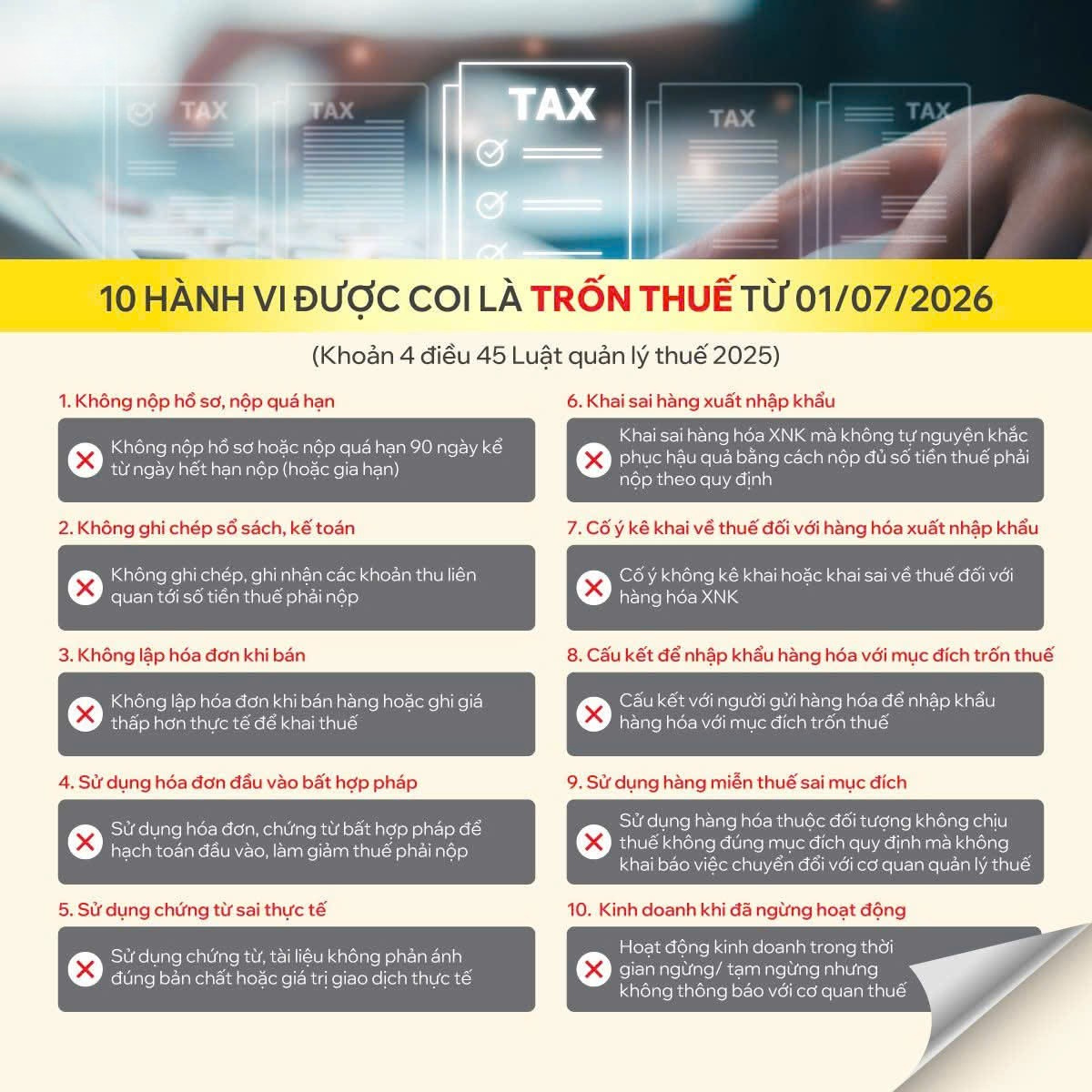 Hành vi không nộp hồ sơ khai thuế hoặc nộp quá hạn 90 ngày kể từ ngày hết hạn nộp (hoặc ngày hết thời hạn gia hạn) được xác định là trốn thuế.
