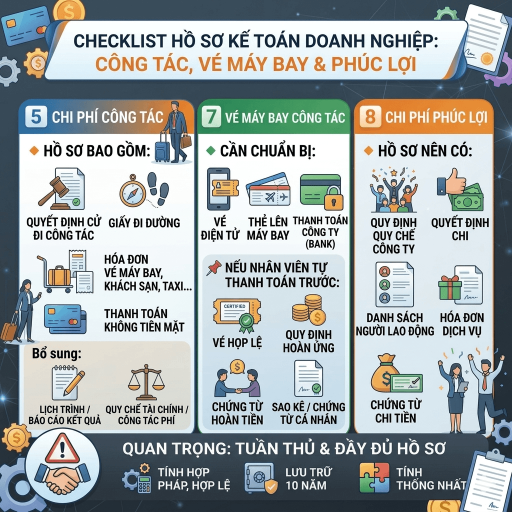 - Công tác phí: Quyết định cử đi công tác, giấy đi đường, hóa đơn (vé máy bay, khách sạn, taxi...), chứng từ thanh toán không tiền mặt.