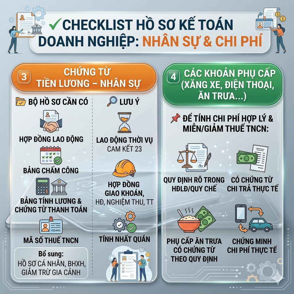- Phụ cấp (Xăng xe, điện thoại, ăn trưa): Phải quy định rõ trong HĐLĐ/Quy chế và có chứng từ chi trả thực tế.