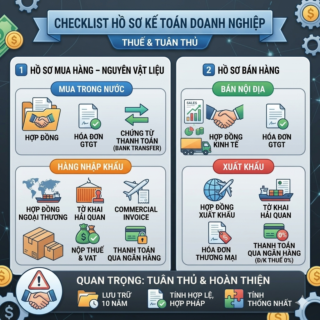 - Hàng nhập khẩu: Bộ hồ sơ gồm Hợp đồng ngoại thương, Tờ khai hải quan, Commercial Invoice, Chứng từ nộp thuế & VAT, và Thanh toán qua ngân hàng.